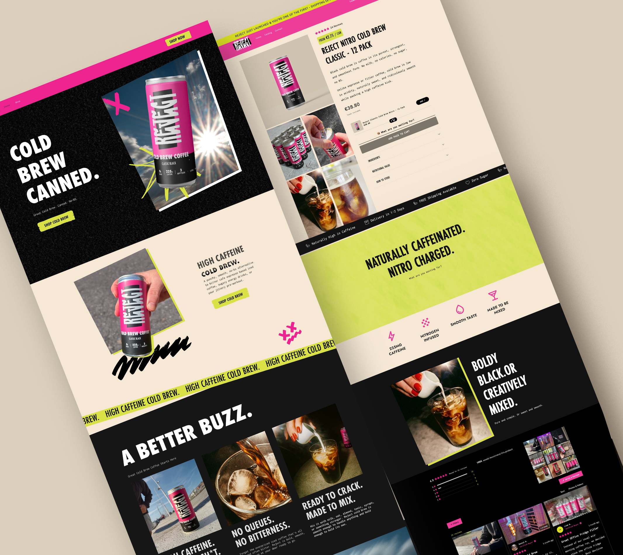 Reject is a rebellious, health-focused RTD cold brew brand built to disrupt the coffee and energy drink market. With a smooth nitro cold brew formula, higher caffeine content, and minimal ingredients, Reject offers a clean energy alternative to expensive café coffees, alcohol, and sugar-laden energy drinks.